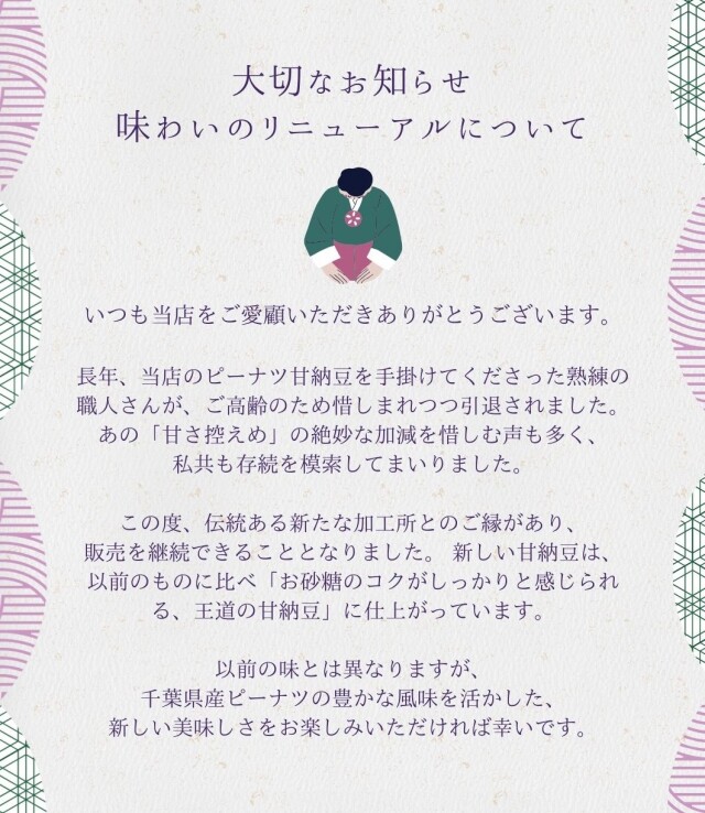 | 備考 | 落花生は風味が命です。賞味期限内であってもなるべくお早めにお召し上がりください。 |
