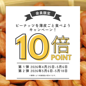 キャンペーン期間中にご購入いただいた対象の薄皮付きピーナッツ商品へのポイント付与率が10%になります(通常1%)。獲得したポイントは次回のお買い物に1ポイント=1円でご利用いただけます。