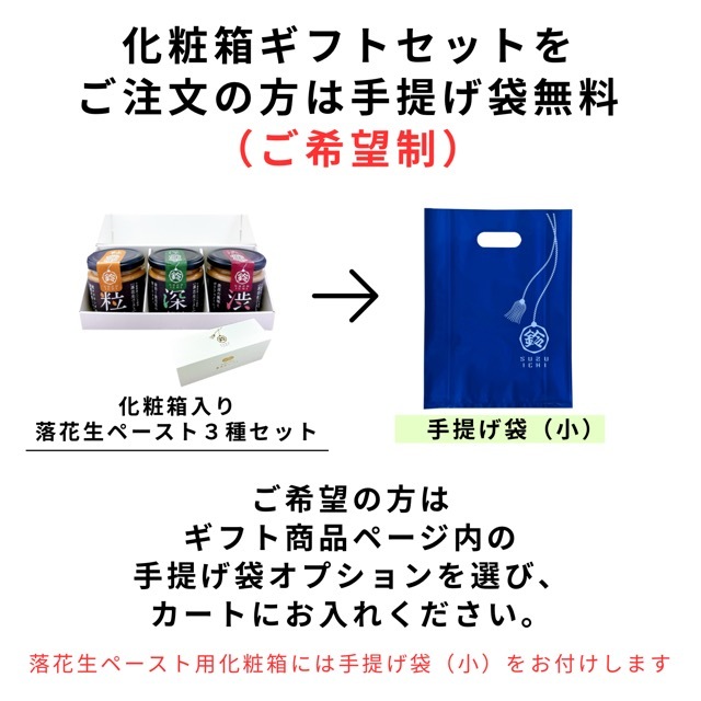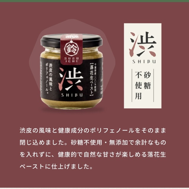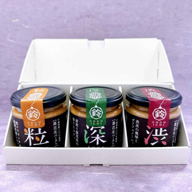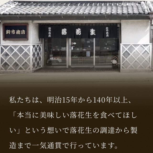 | 原材料 | 【粒】落花生(千葉県産)、てんさい糖、食塩、麦芽糖 【深】落花生(千葉県産)、てんさい糖、食塩、麦芽糖 【渋】落花生(千葉県産) |